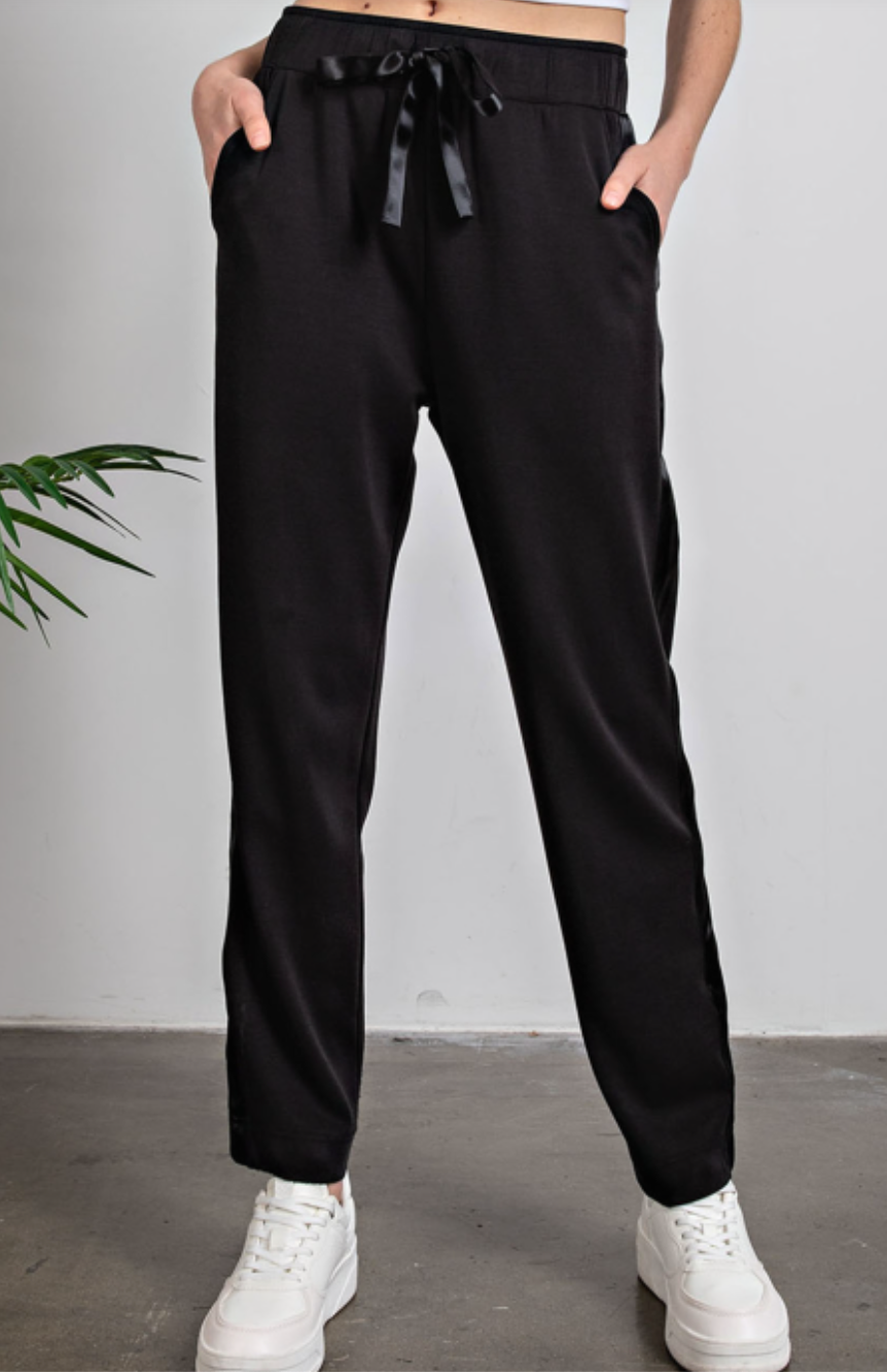 Slip into comfort with these Modal Poly Straight Leg Joggers from Rae Mode! Crafted from a soft modal and poly blend, these joggers feature a sleek straight leg silhouette that's perfect for lounging or running errands. The waist-banded design keeps everything in place, while the adjustable drawstring lets you customize your fit. Practical side pockets provide the perfect spot for your essentials, and a touch of satin detailing on the sides adds just enough style to keep things interesting. Cozy, chic, and ready for anything!