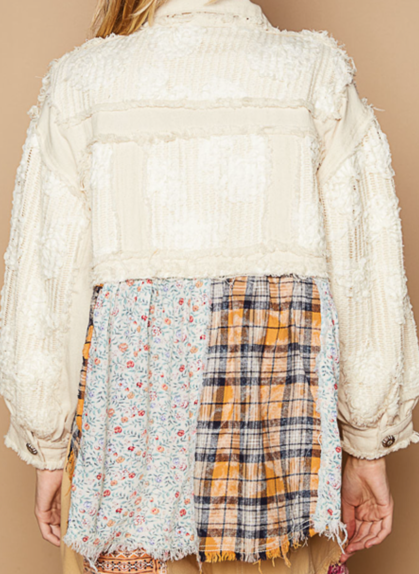 Designed in placket jacekt, balloon sleeve, A-line fit top in twill and crochet lace mix with raw edge detail pointed solid pattern.