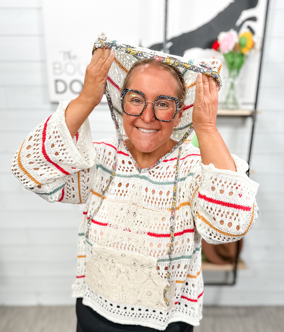 Designed in V-neck long sleeve relaxed fit hoodie thin sweater top in acrylic with star patch, crochet patch pocket, print woven loop point, rolling edge, stripe pattern.
