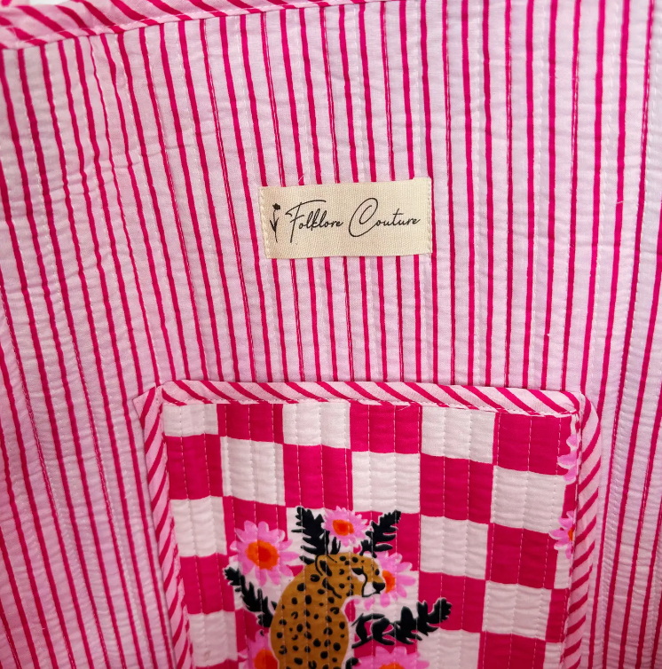 - Our quilted pieces are handmade by Indian artisans. The cotton fabrics are handprinted and proudly sustainably made. With block printed fabrics, there may be some variations and print placement may vary by bag.