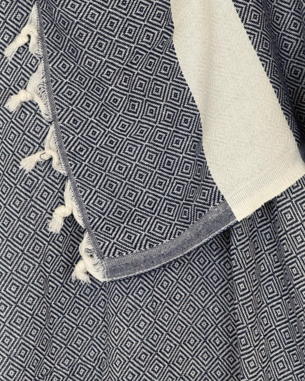 Approx. 39” x 70”. Diamond jacquard weave with tassels