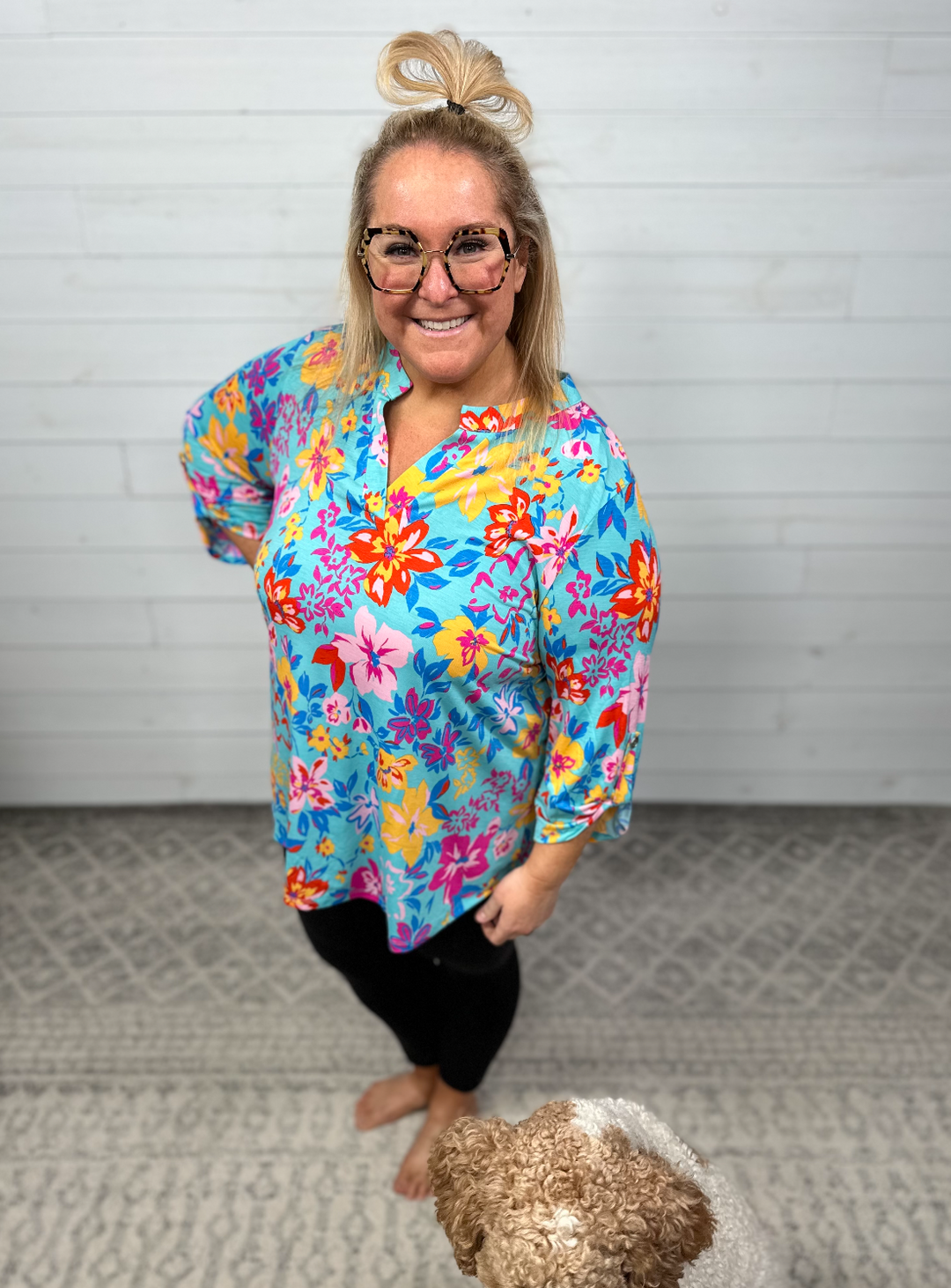 Our signature lizzy top features poly blend which features luxurious softness with lightweight, wrinkle free comfort. This easy care fabric top is travel friendly, cooler than linen and other materials which makes your perfect ON THE GO wear. Lizzy top also features china collar neckline with 3/4" length sleeves with tab details. The fit is relaxed, flowy fit with slight high low.