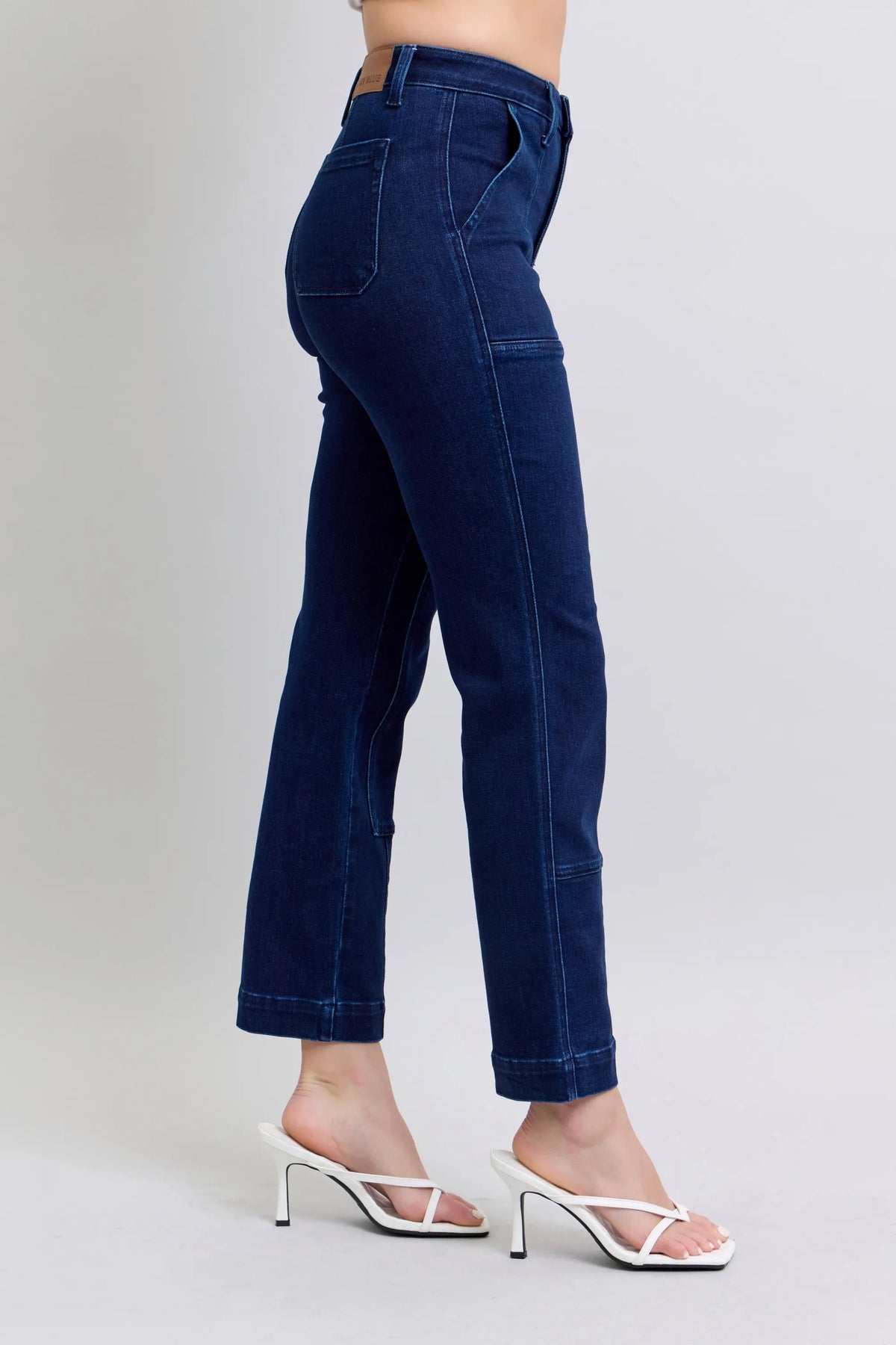 These premium high-waisted straight-leg jeans feature a sophisticated deep indigo wash crafted from high-quality denim blend with subtle stretch for all-day comfort. The standout design element includes carefully placed star-shaped metal studs that add a touch of edgy glamour without overwhelming the classic silhouette. The contrast stitching in complementary thread highlights the construction quality while the cropped ankle length offers modern versatility. Perfect for both casual and semi-dressy occasions, these jeans combine timeless denim appeal with contemporary details.