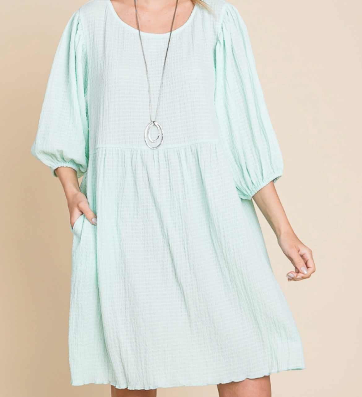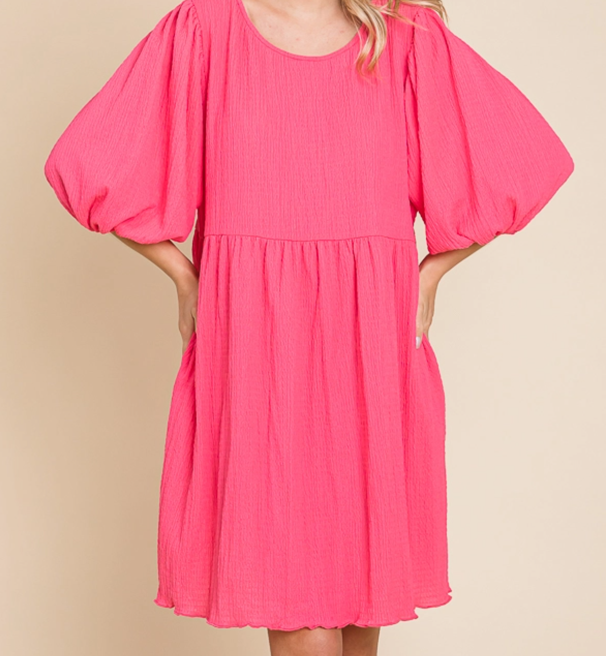This adorable dress is an easy to style staple! The puff sleeves add a playful touch to the dress and are elasticized for a comfortable fit. This dress versatile and easy to style, making it a must-have for any fashion-forward woman. Dress it up with strappy heels and statement jewelry for a chic evening look, or keep it casual with sandals and a straw hat for a laid-back vibe.