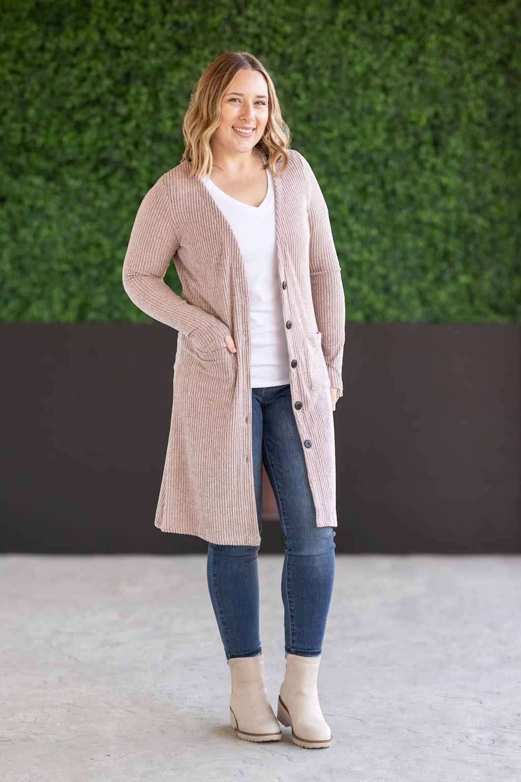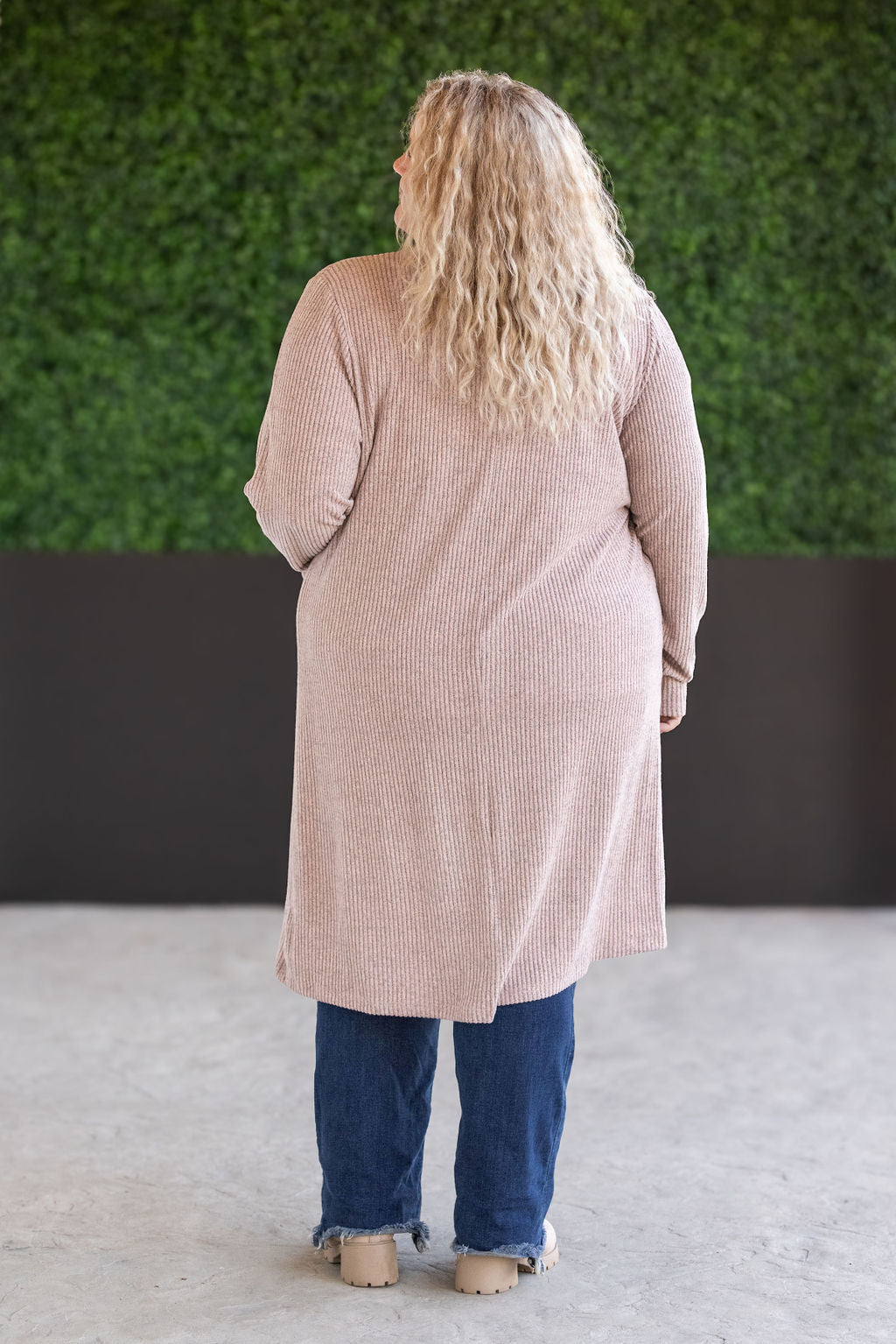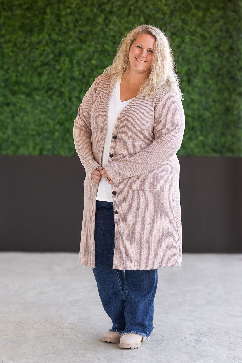This cardigan is going to become your new go-to item to pair with everything in your closet! Longer than a traditional cardigan, but not quite full-length like a duster, we think this length is perfect! Plus, its so soft and has pockets, you'll never want to take it off! This knit fabric is crazy soft and cozy!