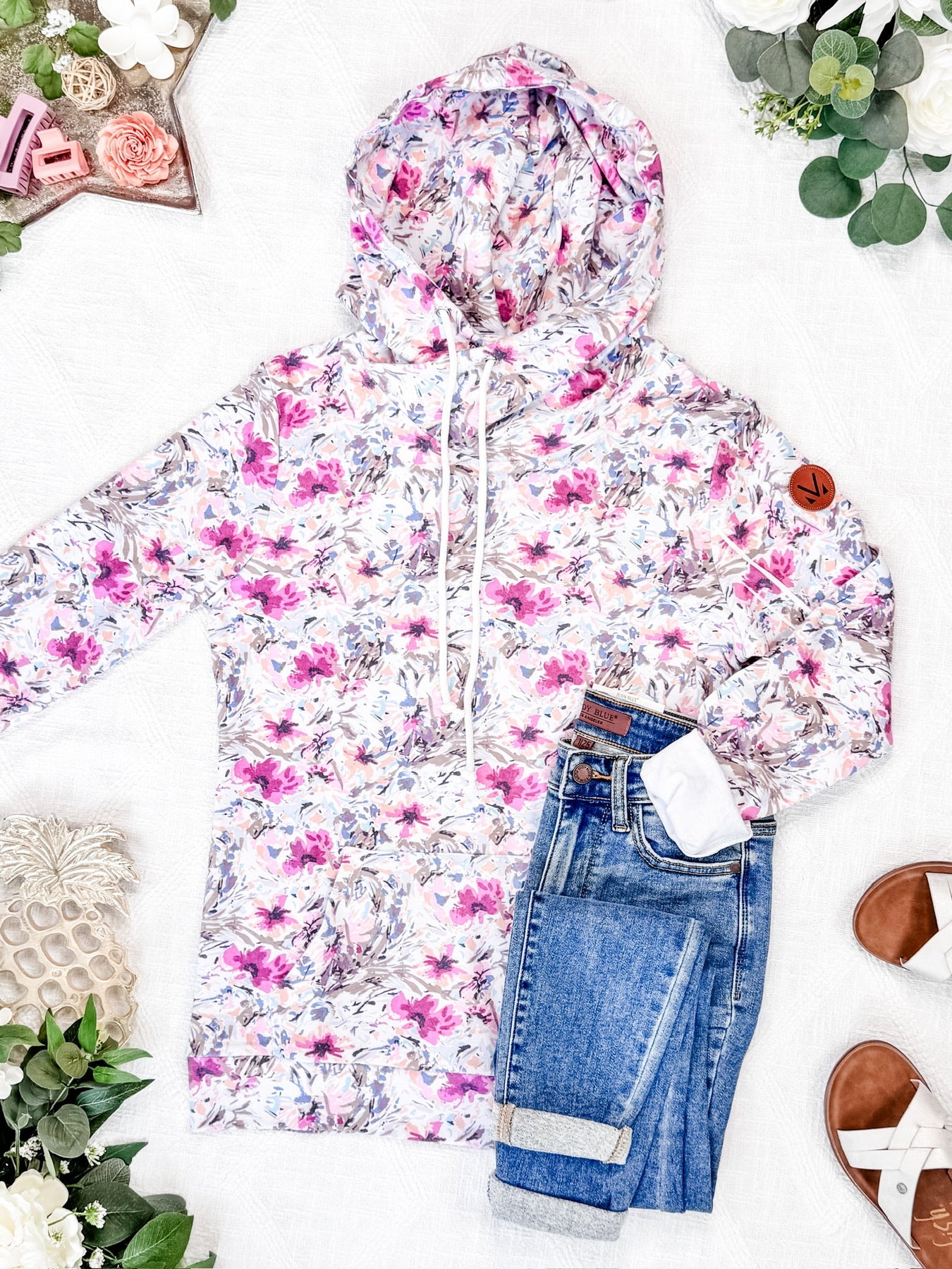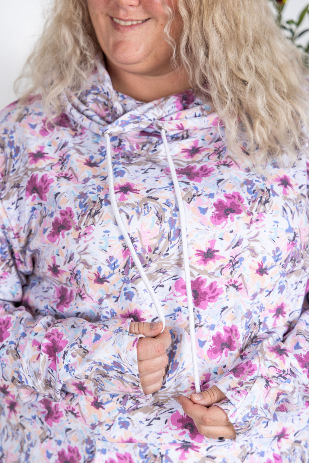Stay cozy and stylish with the Ashley Hoodie in pink and periwinkle floral! The unique abstract floral design is made with triple stretch material, it provides maximum comfort and movement. Keep your hands warm in the kangaroo pocket and use the thumbholes for added convenience. Look and feel happy with this must-have hoodie!