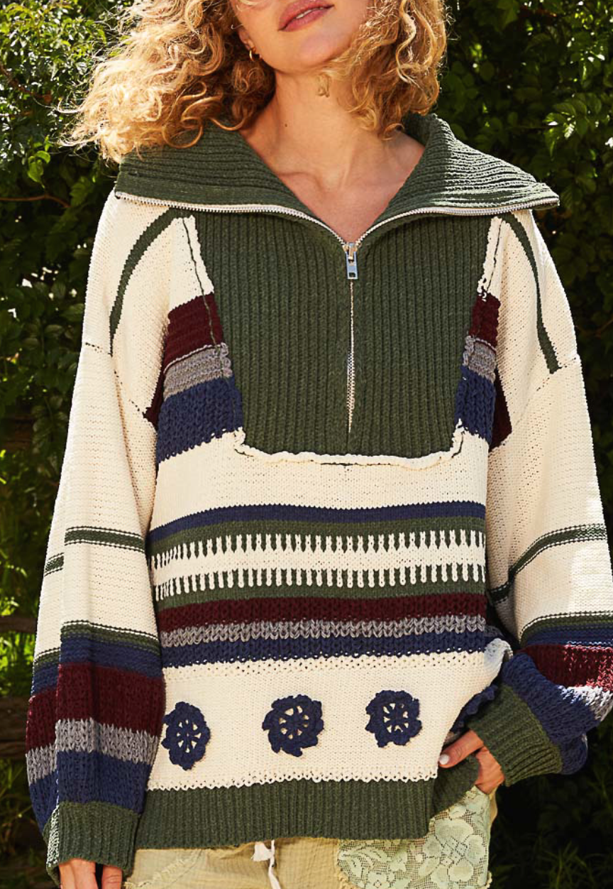 Designed in half zip up, balloon sleeve, roomy fit top in chenille sweater with outseam edge and patch detail pointed striped pattern.
